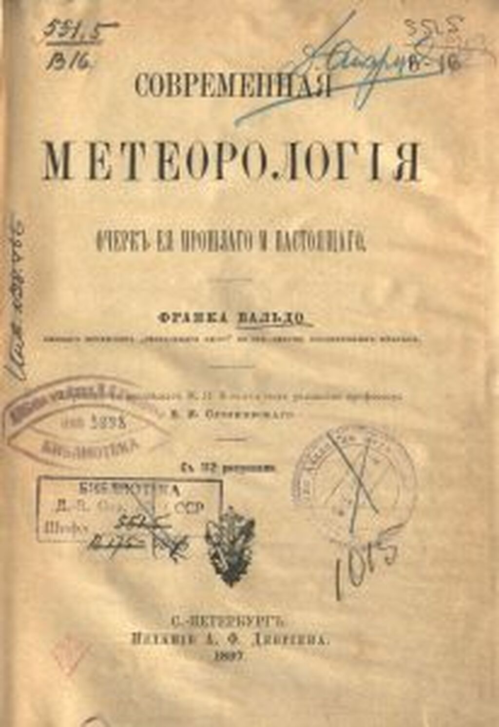 Вальдо, Франк. Современная метеорология: Очерк ее прошлого и настоящего / Ф. Вальдо; пер. М. П. Косач; ред. Б. И. Срезневский. – СПб.: А. Ф. Девриен, 1897. – 380 с.: табл. Переплет издательский. Владельческие знаки: автограф «Д. Старцев», штамп «Дальневосточн. Краевой Научно-Исследовательск. Институт. Библиотека»