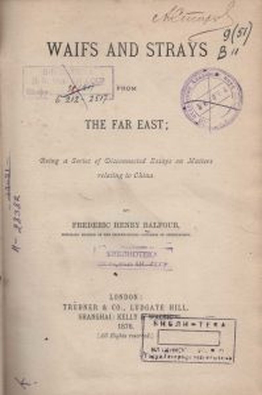 Balfour, Frederick Henry. Waifs and strays from the Far East: Being a series of disconnected essays on matters relating to China [=Беспризорные с Дальнего Востока: серия разрозненных очерков на темы, связанные с Китаем] / F. H. Balfour. – Shanghai; London: Kelly&Walch, 1876. – 233 p. – Англ. яз. Переплет издательский. Владельческие знаки: автограф «А. Старцев», штамп «Библиотека Владивостокского государственного географического общества»