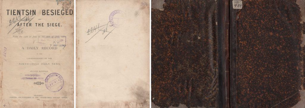 Tientsin besieged and after the siege: From the 15th of June to the 16th of July, 1900. A daily record by the correspondent of the «North-China Daily News» [=Тяньцзинь в осаде и после осады: с 15 июня по 16 июля1900 года. Ежедневные записи корреспондента газеты «Ежедневные новости Северного Китая»]. – Shanghai: North-China Herald, 1901. – 45 p. – Англ. яз. Переплет владельческий: кожаный корешок с золотым тиснением (название), мраморная бумага в коричневых тонах. Владельческие знаки: штамп «Библиотека Н. А. Старцева»