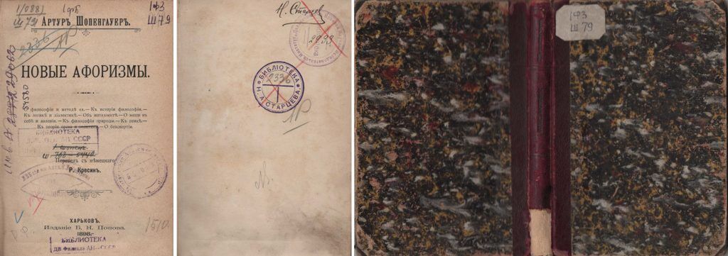 Шопенгауэр, Артур. Новые афоризмы / А. Шопенгауэр; пер. Р. Кресин. – Харьков: Б. Н. Попов, 1898. – 196 с. Переплет владельческий: кожаный корешок, мраморная бумага в серых и желтых тонах. Владельческий знак: штамп «Библиотека Н. А. Старцева»