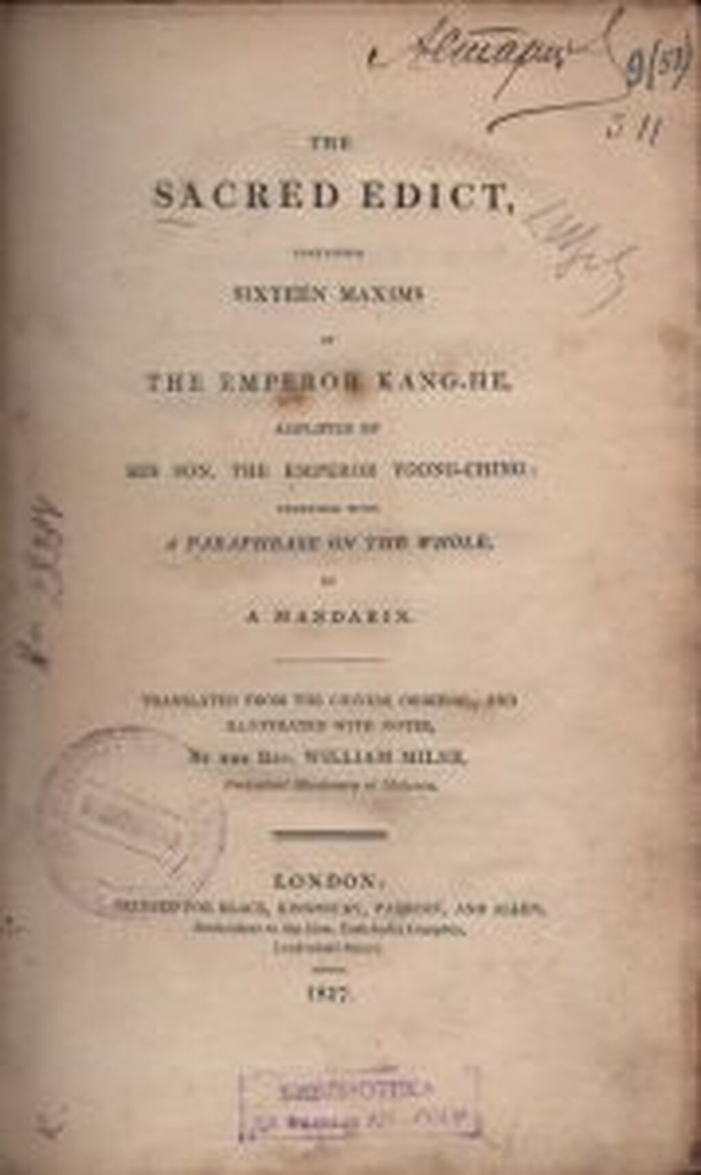 The Sacred edict, containing sixteen maxims of the emperor Kang-he, amplified by his son, the emperor Yoong-ching, together with a paraphrase on the whole, by a mandarin: Translated from the Chinese original and illustrated with notes [=Священный эдикт, содержащий шестнадцать принципов императора Канси, дополненный его сыном императором Юнчжэном, в общем официальном изложении: переведено с китайского оригинала и разъяснено в примечаниях]. – London, 1817. – 299 p. – Англ. яз. Переплет владельческий (?): кожаный корешок и уголки, бумага однотонная коричневого цвета. Владельческие знаки: автограф «А. Старцев»