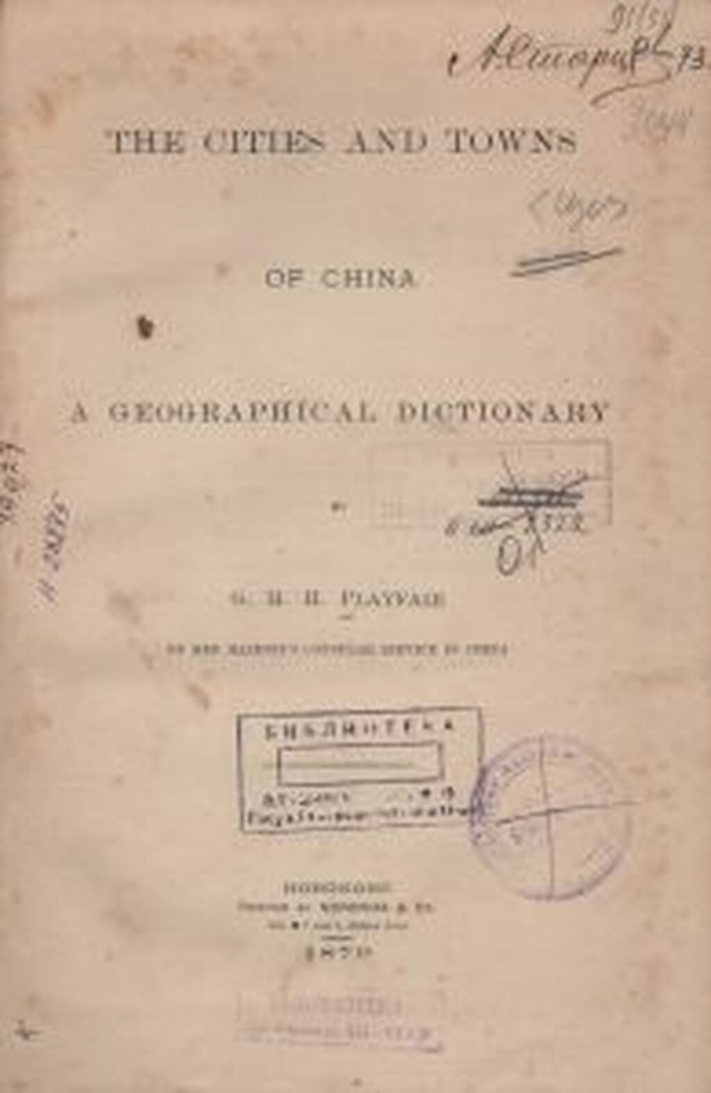 Playfair, G. M. H. The cities and towns of China: A geographical dictionary [=Большие и малые города Китая: географический словарь] / G. M. H. Playfair. – [S. l.]: Noronha & Co., 1879. – LVIII, 417, 30 p. – Англ. яз. Переплет издательский. Владельческие знаки: автограф «А. Старцев», штамп «Библиотека Владивостокского государственного географического общества»