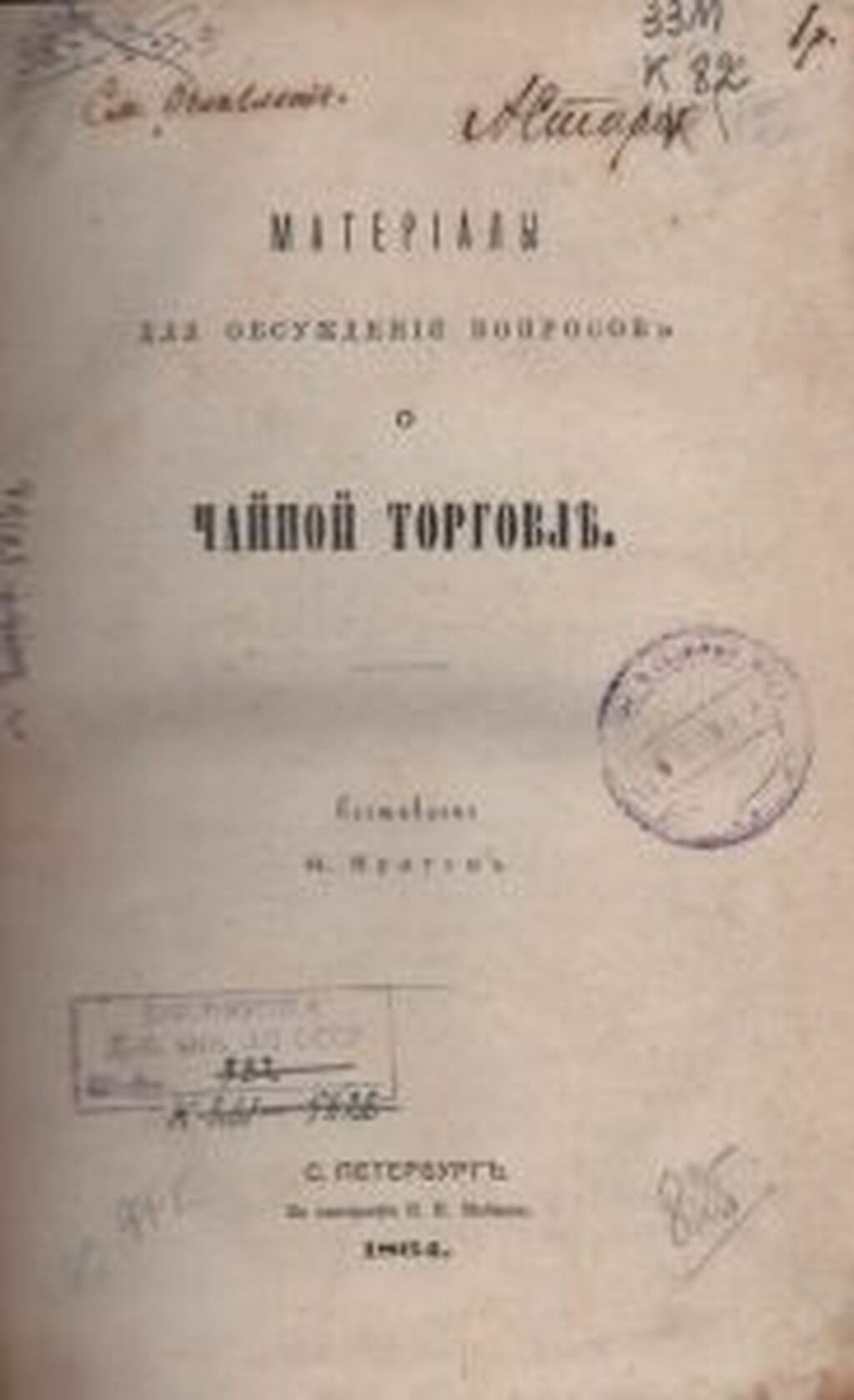 Крит, Н. Материалы для обсуждения вопросов о чайной торговле / Н. Крит. – СПб., 1864. – 200 с.: ил. Переплет владельческий (?): кожаный корешок со слепым тиснением, коленкор коричневого цвета. Владельческие знаки: автограф «А. Старцев»