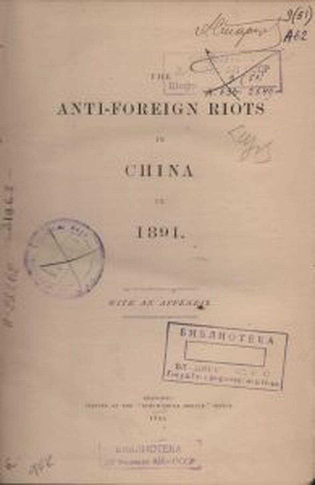 The anti-foreign riots in China in 1891 [=Анти-иностранные восстания в Китае в 1891 году]. – Sanghai: Norht-China Herald, 1892. – 304 p. – Англ. яз. Переплет издательский. Владельческие знаки: автограф «А. Старцев», штамп «Библиотека Владивостокского государственного географического общества»