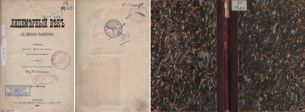 Мантегацца, Паоло. Лицемерный век / П. Мантегацца ; пер. Н. Лейненберг. – Одесса, 1889. – 62 с. Переплет владельческий: кожаный корешок, мраморная бумага в серых и жетных тонах. Владельческий знак: автограф «Н. Старцев», штамп «Библиотека Н. А. Старцева», штамп «Дальневосточн. Краевой Научно-Исследовательск. Институт. Библиотека»