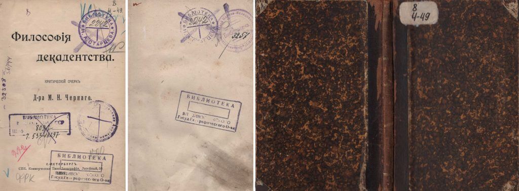 Черный, М. Н. Философия декадентства: Критический очерк / М. Н. Черный. – СПб. : [б. и.], 1899. – 69 с. Переплет владельческий: кожаный корешок с золотым тиснением (название), мраморная бумага в коричневых тонах. Владельческие знаки: штамп «Библиотека Н. А. Старцева», штамп «Библиотека Владивостокского государственного географического общества»