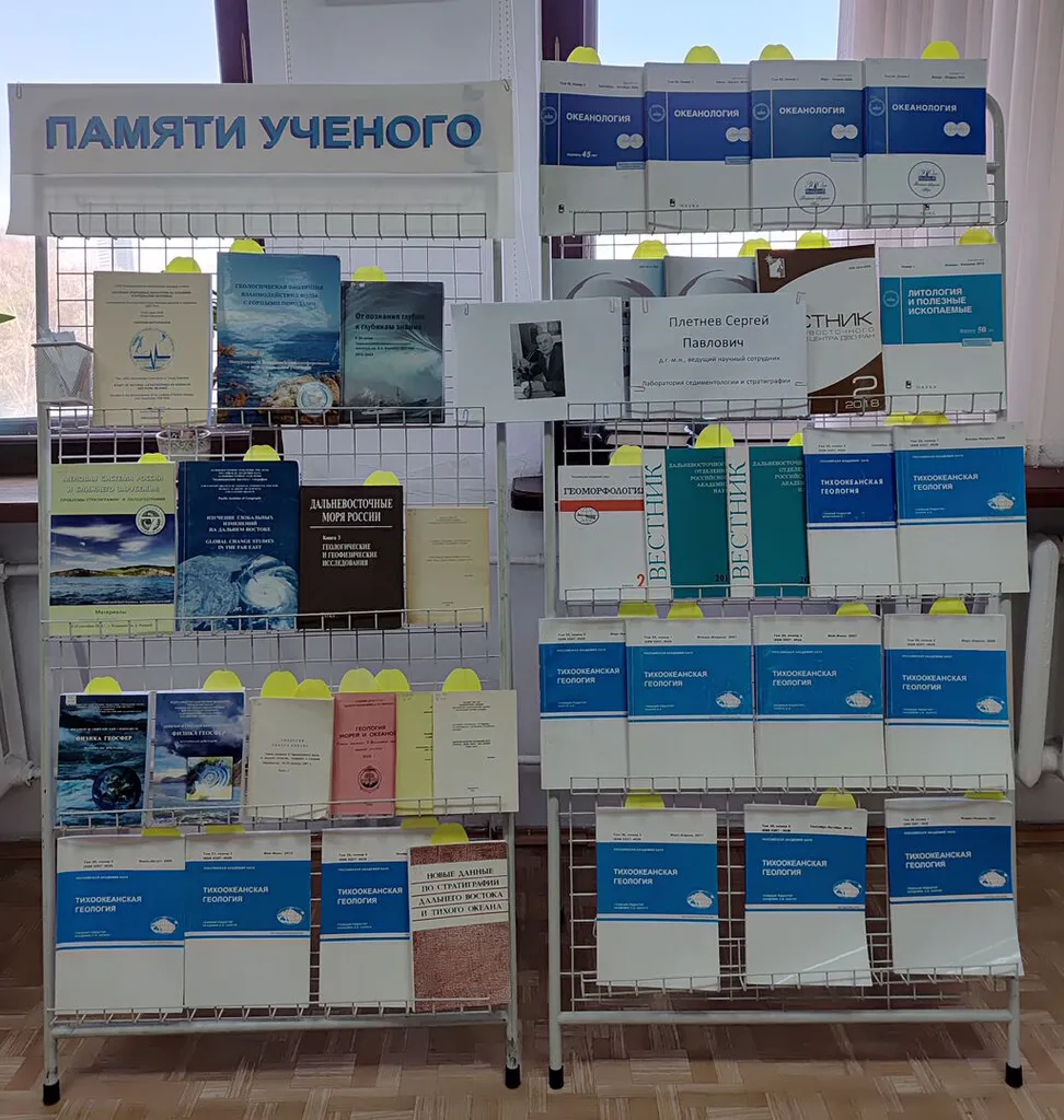 В читальном зале Центральной научной библиотеки при Тихоокеанском океанологическом институте им. В. И. Ильичёва начала работу выставка, посвящённая памяти ведущего научного сотрудника лаборатории седиментологии и стратиграфии, доктора геолого-минералогических наук Плетнёва Сергея Павловича (1951–2026).