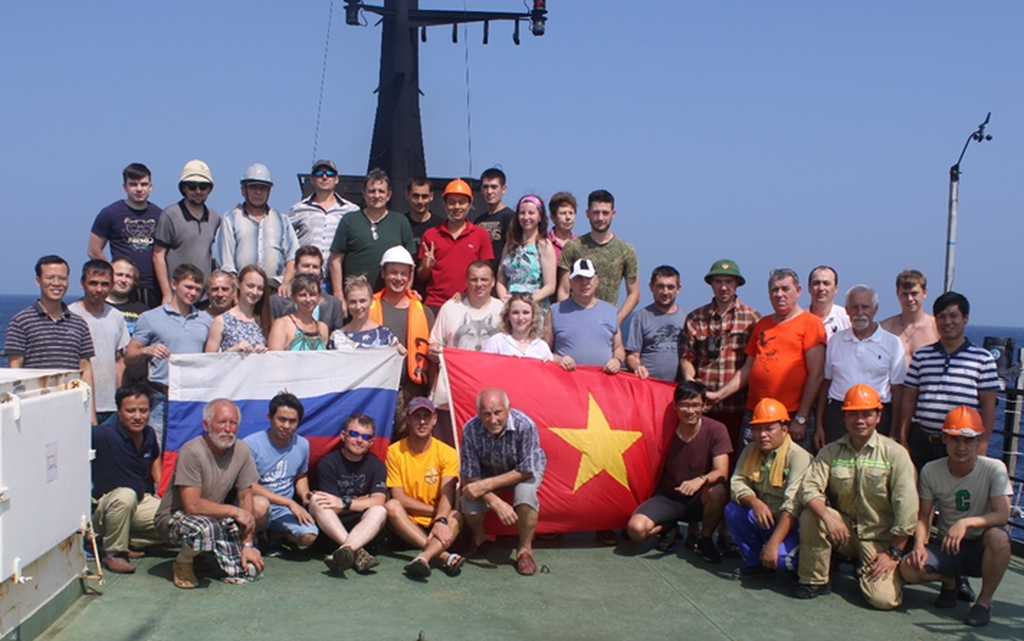Групповое фото участников экспедиции в территориальных водах Вьетнама Южно-Китайского моря на НИС «Академик М.А. Лаврентьев». Рейс № 88. 2019 г.