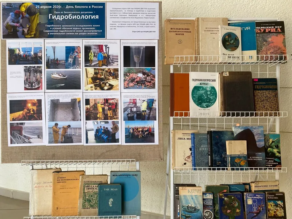 В отделе ЦНБ при ННЦМБ ДВО РАН открылась книжно-иллюстративная выставка, посвященная ученым — гидробиологам. В этом году День Биолога в России отмечается 25-го апреля, а гидробиология — одна из биологических дисциплин. Гидробиологи — это биологи, которые занимаются исследованием жизни и условий обитания водных организмов. В задачи гидробиологии входит изучение биологического разнообразия, влияния на биологические сообщества природных факторов и хозяйственной деятельности человека, разработка научных основ рационального использования биологических ресурсов водной среды. Морских гидробиологов интересуют законы формирования биологической продуктивности океанов и морей, их биологическая структура.