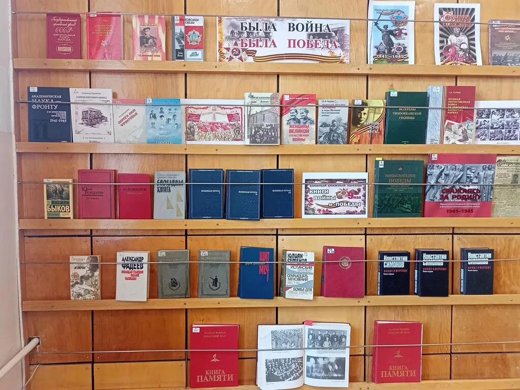 На выставке представлены книги, рассказывающие о судьбах тех, кто беззаветно защищал Родину, и о тех, кто пережил этот трагический период в истории нашей страны. Списки погибших можно найти в «Книгах Памяти». Особый интерес представляет уникальная книга «Великая Отечественная война на открытках, конвертах и марках» из личной коллекции Г. П. Турмова, а также другие художественные произведения о войне.